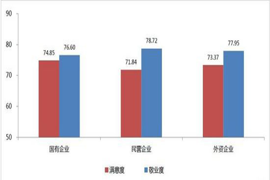外資企業(yè)員工的滿意度與敬業(yè)度介乎國(guó)企與外企之間,同時(shí)發(fā)現(xiàn)國(guó)企存在的問題是,其員工滿意度水平較高但敬業(yè)度水平有待改進(jìn)。